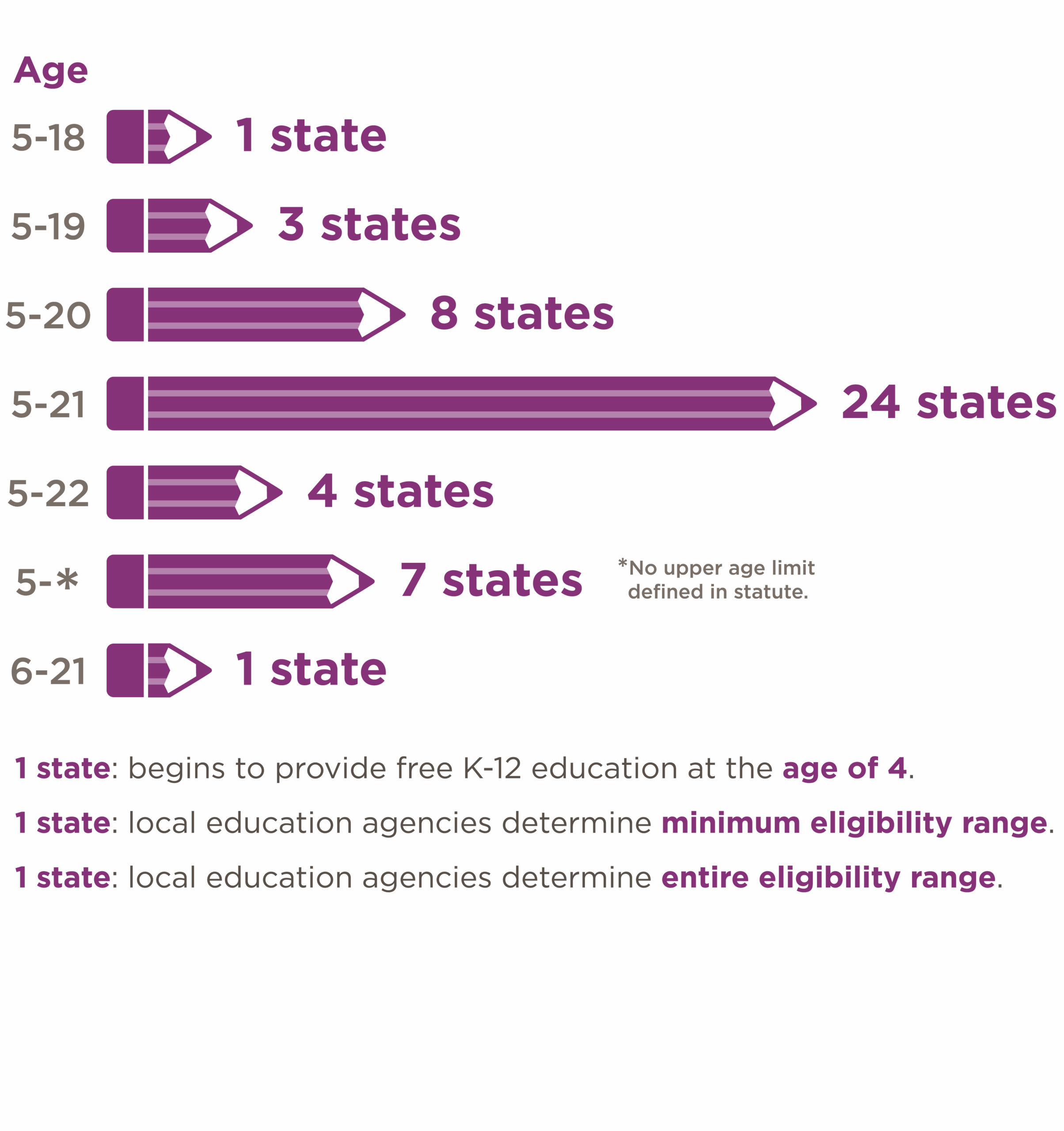 Age requirements for free K-12 education are typically more consistent from state to state, though some variation still exists in the upper age limits that states set. Regardless of their specific age requirements for free education, all states are also subject to the Individuals with Disabilities Education Act (IDEA), which requires that individuals with disabilities between the ages of three and 21 are provided with a free appropriate public education.