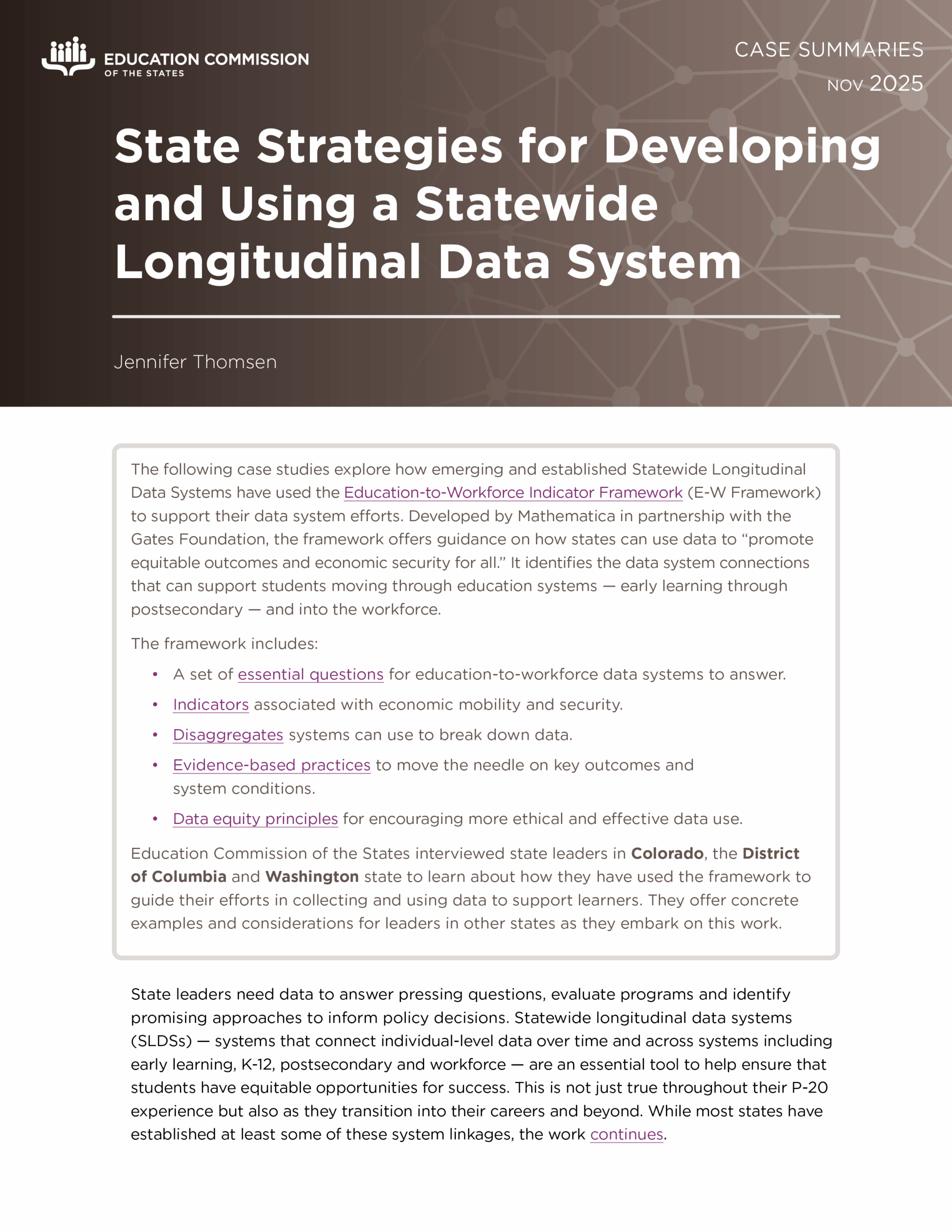 To help state leaders start this process, Education Commission of the States developed a set of practical resources that can help states use the framework to improve data collection and reporting.